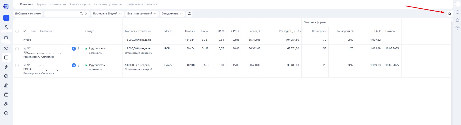 Реклама без аналитики — деньги на ветер. Зайдите в настройки кампании и посмотрите на поле «Конверсии». Там должно быть выбрано целевое действие: «Отправка формы», «Звонок» или «Покупка».