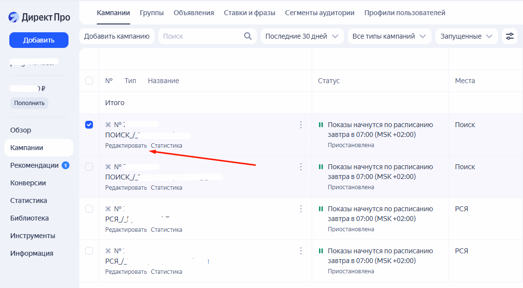 ![]() Перейдем к редактированию Рекламной кампании | ![]() Далее перейдем на уровень объявления: |